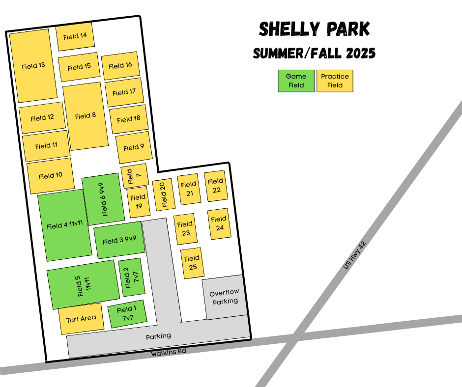 Shelly Park is undergoing some changes for the Fall 2025 season! An updated field map is below: